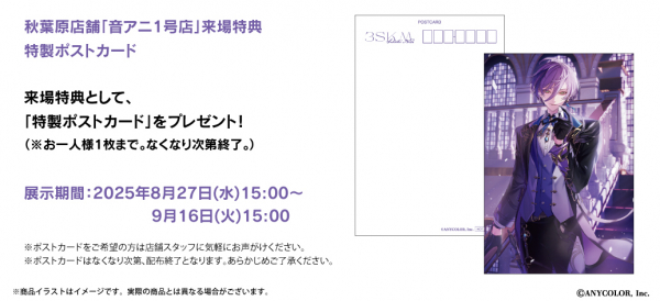 また、弊社秋葉原店舗「音アニ」では8月27日(水)15:00より「A4クリアファイル」および「ワイヤレス充電器」の販売と同時に実機展示を実施いたします。本モデルに搭載される録り下ろしボイスや音質を確認できるほか、店頭設置の専用QRコードからもご購入いただけます。ご来店特典として、オリジナルポストカードの配布をさせていただきます。ただし、こちらは数量に上限がございますので配布はお1人様1日1枚、無くなり次第終了となります。