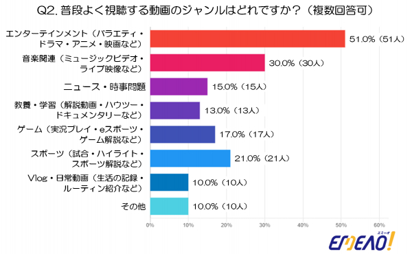 最も多かったのは、「エンターテイメント(バラエティ・ドラマ・アニメ・映画など)」で、全体の51%(51人)を占めています。これは、動画視聴の中でエンターテイメント関連コンテンツが圧倒的に人気を集めていることを示しており、視聴者が娯楽を目的として動画を消費していることがわかります。