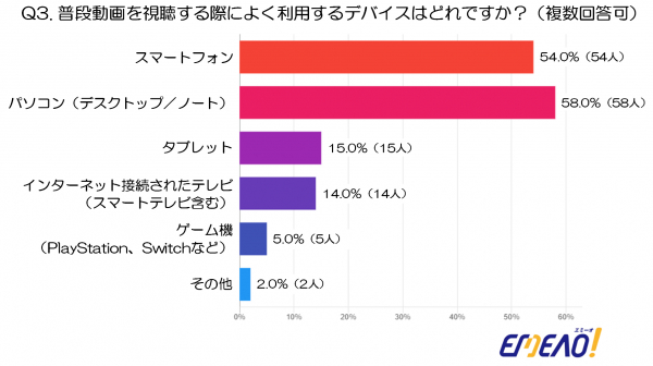 3.デバイスの多様化:最も利用されているのはパソコンで、次いでスマートフォン、さらにタブレットと続きます。それぞれのデバイスが特性に応じて使い分けられており、大画面での集中視聴や、隙間時間の手軽な利用など、場所やシーンに応じて柔軟に選択されている様子が伺えます。