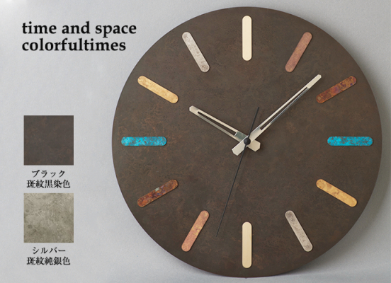 富山・高岡に伝わる金属着色の伝統技法を用い、真鍮に独自の色彩を宿した掛け時計「time and space(colorfultimes)」。