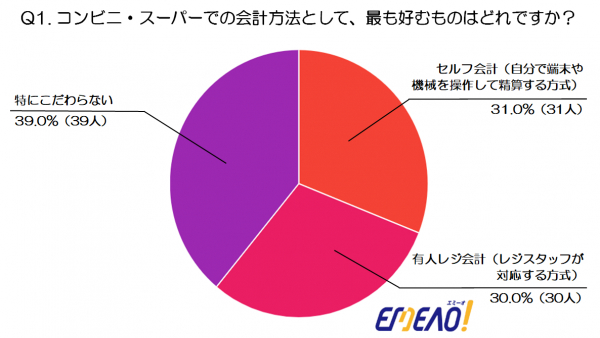 次いで「セルフ会計」が31%(31人)、「有人レジ会計」が30%(30人)と、ほぼ同じ割合となっており、利用者の好みが二分されている点が特徴的です。