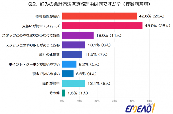 さらに「会計の正確さ」11.5%(7人)や「ポイント・クーポンが使いやすい」8.2%(5人)、「現金で払い やすい」6.6%(4人)といった理由も挙げられ、効率や利便性が中心ではあるものの、人によって重視するポイントが多様であることがうかがえます。