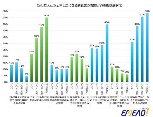 「居心地が良く、友人と長時間過ごしたくなる空間」は70代以上53%、50・60代51%、30・40代43%と、ほぼ全世代で高い支持を集めました。