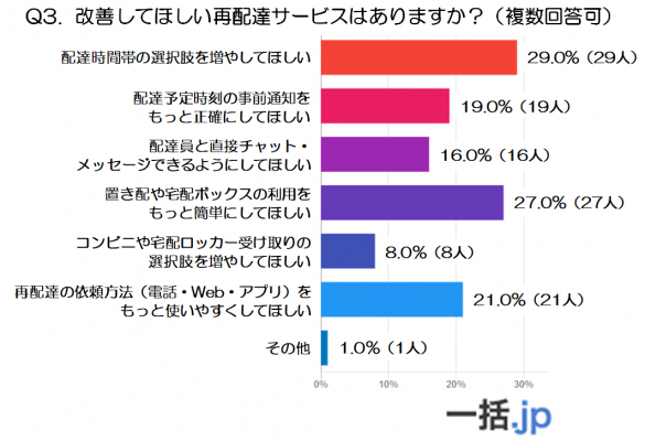 最も多かったのは「配達時間帯の選択肢を増やしてほしい」で、29.0%(29人)が回答しています。次いで「置き配や宅配ボックスの利用をもっと簡単にしてほしい」が27.0%(27人)と僅差で続き、受け取り時間と方法の柔軟性を重視する声が目立ちます。