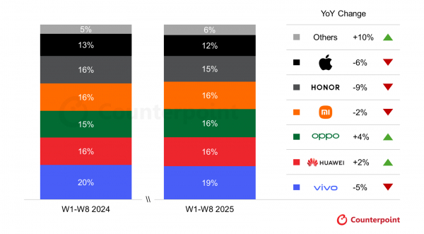 ・2025年第3四半期の最初の8週間、中国のスマートフォン販売はvivoとHONORの主要製品の減少により、前年比2%減少しました。