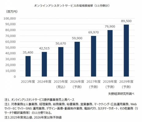 2025年度のオンラインアシスタントサービス市場規模(11分野計)は事業者売上高ベースで、前年度比19.2%増の506億7,000万円の見込み、2029年度には895億円に達すると予測する。