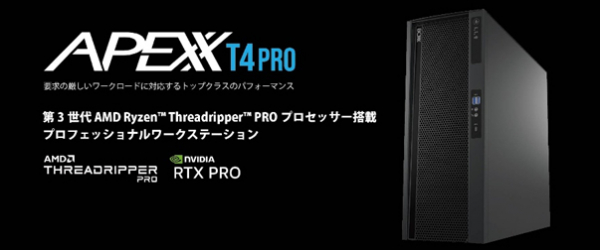 「APEXX T4 PRO」は、NVIDIAの最新GPU、NVIDIA RTX PRO(TM)シリーズに対応し、NVIDIA RTX PRO(TM) 6000 Blackwell Max-Q Workstation Edition Desktop GPUを2基まで搭載することができます。また、CPUには、AMD Ryzen(TM) Threadripper(TM) PROを搭載。プロセッシングコアの数と革新的な機能によって、VFXアーティスト、モーションエディター、さらにアーキテクトやエンジニアを、これまで以上に迅速に制作することを可能にします。
