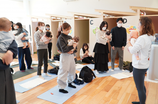 今回の両親学級には、妊娠中の方から産後1歳半頃までの親子が参加され、幅広い月齢の赤ちゃんと保護者のみなさんが交流しながら学びを深めました。