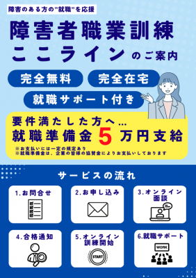 障害者向けオンライン職業訓練「ここライン」開校。訓練終了後は就職サポートに加え、規定を満たした受講者へ就職準備金5万円を支給。「無理なく、安心して就職を目指せる」環境を提供。