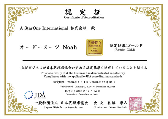 オーダースーツNoah、優良ビジネス認定「GBCゴールド」を3年連続受賞 業界初の実績業界開業数No.1のオーダースーツNoahを運営するA-StarOne International株式会社(東京都千代田区区 代表:坂本大地)は、代理店ビジネスの普及促進を図る一般社団法人日本代理店協会(JDA)が実施する優良ビジネス認定2026(Good Business Certification)において、「オーダースーツNoah」2025年に続き、最高ランクであるゴールド認定を3年連続で取得したことをお知らせいたします。