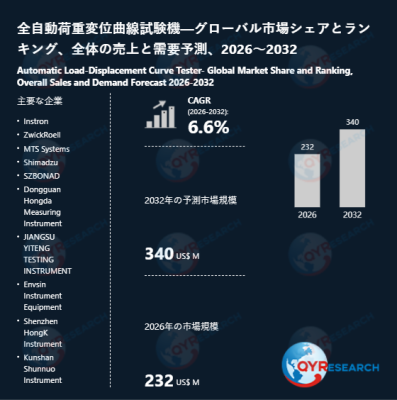 QY Research株式会社(所在地:東京都中央区)は、「全自動荷重変位曲線試験機―グローバル市場シェアとランキング、全体の売上と需要予測、2026〜2032」に関する最新調査レポートを公開しました。本レポートでは、全自動荷重変位曲線試験機の世界市場を対象に、市場規模、販売数量、価格推移、市場シェア、主要企業の競争ポジションを体系的に整理し、地域別・国別の動向に加えて、製品タイプ別および用途別の詳細セグメント分析を掲載しています。さらに、2021年から2032年までのデータを基に市場の中長期的な成長軌道を検証し、将来的な拡大余地や投資機会を提示するとともに、競争環境の構造変化や企業戦略の方向性、業界が直面する課題についても多面的に考察しています。