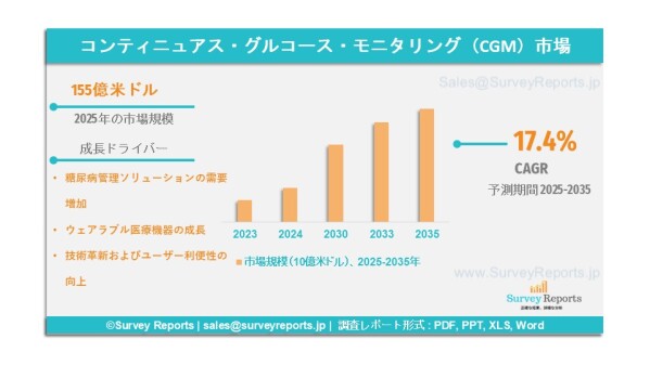 Survey Reports LLCは2026年4月に、持続血糖モニタリング(CGM)市場に関する調査レポートを発行したと発表した。本レポートは、コンポーネント別(センサー、トランスミッター、レシーバー)、エンドユーザー別(病院・クリニック、在宅・個人)、人口統計別(成人、小児)に市場を区分し、2026年から2036年までの世界市場分析、動向、機会および予測を提示するものである。本レポートは、CGM市場の予測評価を提供するとともに、成長要因、市場機会、課題および脅威といった主要な市場ダイナミクスを明らかにしている。