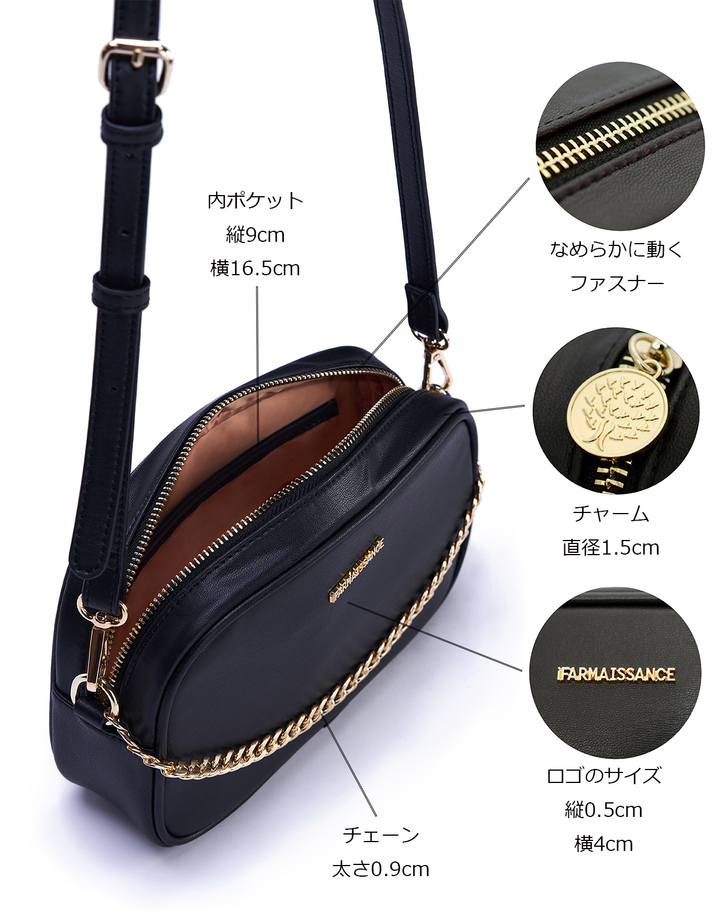 ちょっとしたパーティやおしゃれを楽しみたいシーンでは、ゴールドチェーンを持ち手として。動物の皮を使用していないため、革製品を避けるのがマナーとされるウエディングのお呼ばれにも使えます。?