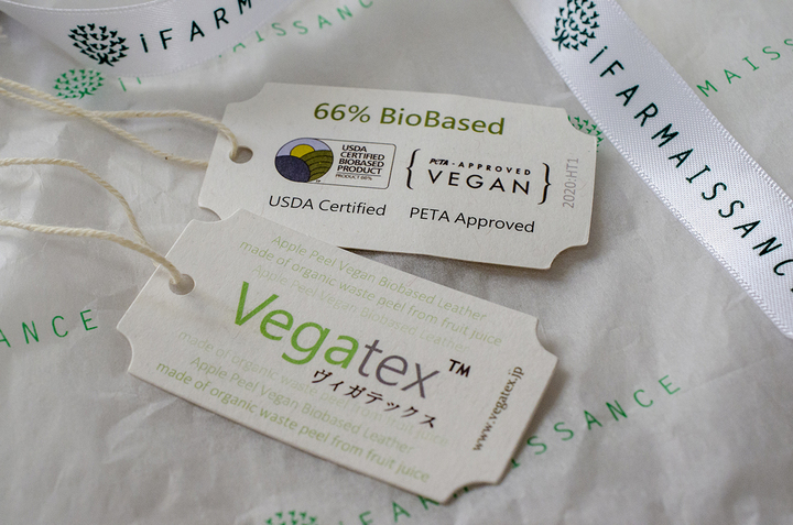 iFarmaissanceは、その中でも特にバイオベースの含有量が高い「VEGATEX Apple Leather(ヴィガテックス アップルレザー)」を使用。全原料の66%がバイオベースのアプルレザーで、米国農務省SUDA、動物愛護団体PETAからも認証マークの使用が認められています。