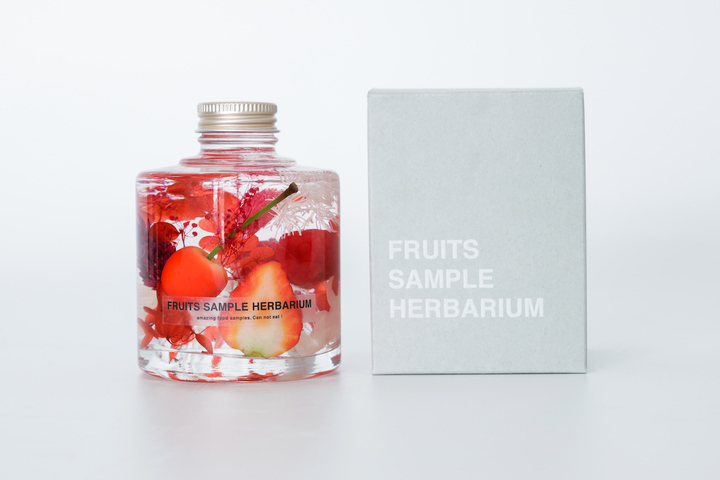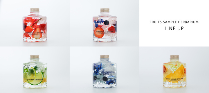 個性的な瓶は縦にスタックできる形状を採用し、果実・花材のズレを抑える技法は独自に開発されています。taberemasen店舗限定での販売です。