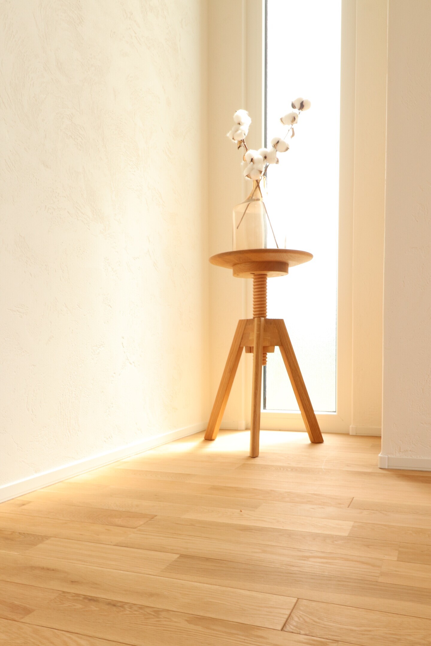 床には、しっとりと温もりを感じられる無垢のナラ材を採用しています。無垢材は天然の木をそのまま切り出して作られるため、木の細胞がまだ呼吸をしている状態です。
