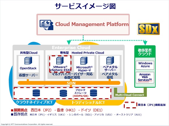 NTTコミュニケーションズ株式会社(略称:NTT Com)は、7月27日より、専有型(Hosted Private)Cloudと、OpenStackを採用した共有型Cloudを組み合わせた企業向けクラウドサービス「Enterprise Cloud」を、東日本(JP1)などに加えて、西日本(JP2)・香港(HK1)・ドイツ(DE1)の拠点からも提供します。