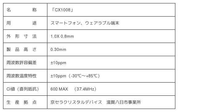 このたび当社が培ってきた水晶素子の設計技術と大阪大学 山村和也准教授と共同開発した独自のプロセス技術により、小型化を実現しつつ当社従来品「CX1210」(1.2×1.0mm)と同等の電気特性を有する超小型水晶振動子「CX1008」(1.0×0.8mm)を製品化しました。