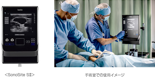 「SonoSite SII」は、モニターと操作部を一体化させた、タッチパネル採用のフルフラット型超音波画像診断装置です。画像の輝度や深さを調整するジョグダイヤルを除くすべての操作部をタッチパネルにすることで、検査時の操作性を向上させるとともに、手術室などで薬品や血液が付着しても容易に清掃・消毒できます。また、プローブを2本同時に接続することができるので、診断部位に応じて即座にプローブを切り替えることができます。