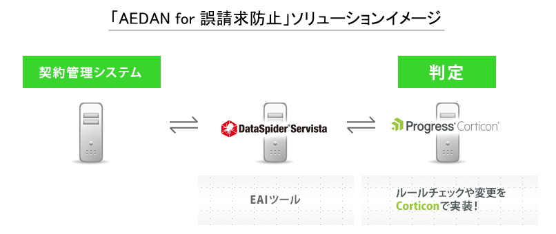 AEDANのディシジョン自動化エンジンであるProgress Corticonに料金計算ルールを実装し、既存の契約管理システムから、EAIツールDataSpider Servistaを用いて抽出した請求明細データをチェック/判定することで、請求金額に間違いがないかを検証できます。「AEDAN for 誤請求防止」ソリューションにより、既存システムと併存しながら、改修コストや業務改善などの課題を解決することが可能になります。