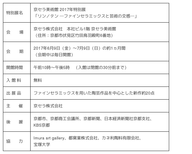 京セラ株式会社(社長:谷本 秀夫)は、社会貢献活動の一環で開設している京セラ美術館(京セラ本社ビル1階)において、本年6月9日(金)から7月9日(日)までの約1ヵ月間、2017年特別展「リン/テン ファインセラミックスと芸術の交感」を開催します。