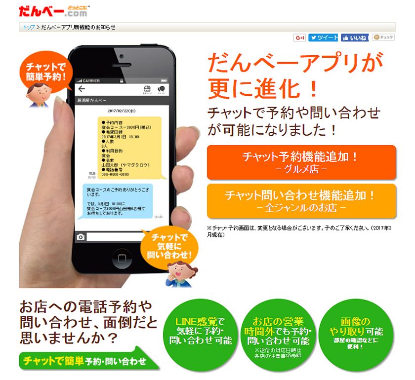 ・LINE@のように店舗と「友だち」になる必要はなく、「だんべー.com」掲載店舗のうちチャット利用登録している全店と気軽にチャットが行えます。(約200店舗(2017年5月時点))