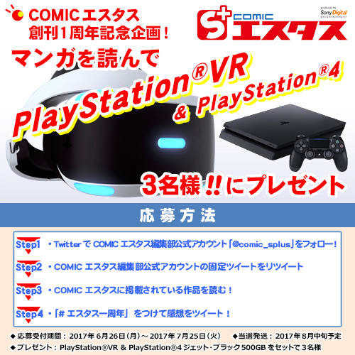 ◆COMICエスタス編集部の公式アカウント「@comic_splus」にて指定の条件でツイートすると豪華PSVR&PS4をセットで3名様にプレゼント!!
