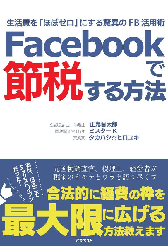 株式会社アスペクト(本社:東京都台東区、代表取締役:高比良公成)は、2017年6月22日に書籍『Facebookで節税する方法』を発売します。本書籍は、著者である実業家のタカハシ☆ヒロユキ氏、税理士/公認会計士である正鬼晋太郎氏、元国税調査官であるミスターKの3人が、常日頃考えている税金に関する知識をまとめたもので、“合法的に”経費の枠を最大限に広げる方法が紹介されています。