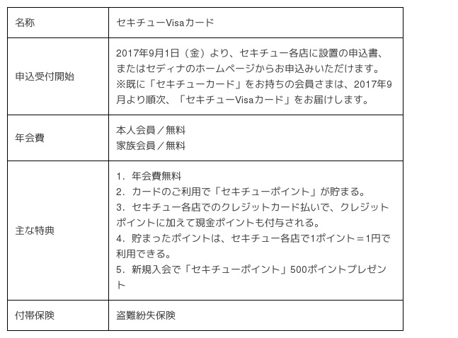三井住友フィナンシャルグループの株式会社セディナ(東京本社:東京都港区/代表取締役社長 中西 智、以下「セディナ」)は、株式会社セキチュー(本社:群馬県高崎市/代表取締役社長 関口 忠弘、以下「セキチュー」)との提携クレジットカード「セキチューカード」をリニューアルし、9月1日より、新たに現金ポイント一体型クレジットカード「セキチューVisaカード」の申込受付を開始しますので、お知らせいたします。