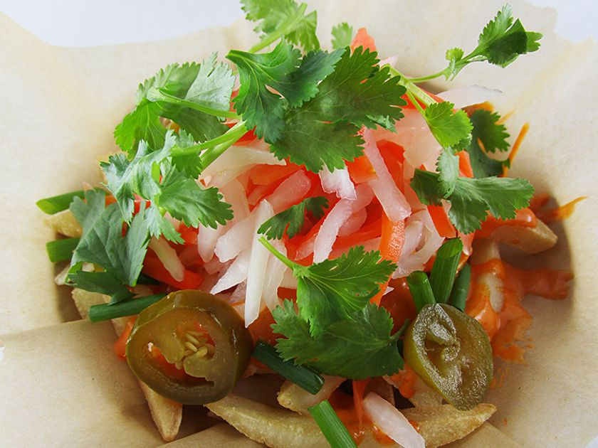ジューシーバインミーに新たに登場したローデッドフライズのバインミーバージョン、「ローデッドバインミーフライズ」は、ニューヨーク等欧米で食べられているメニューを再現。揚げたてサックリ・ホクホクのポテトの上に、バインミーの具材であるなます・ネギ・パクチーをのせてスパイシーマヨをかけ、最後にハラペーニョをトッピング。ポテトなのにヘルシーさすら感じさせるベトナムマジックが効いた、味わいも見栄えも抜群の一品に仕上がりました。