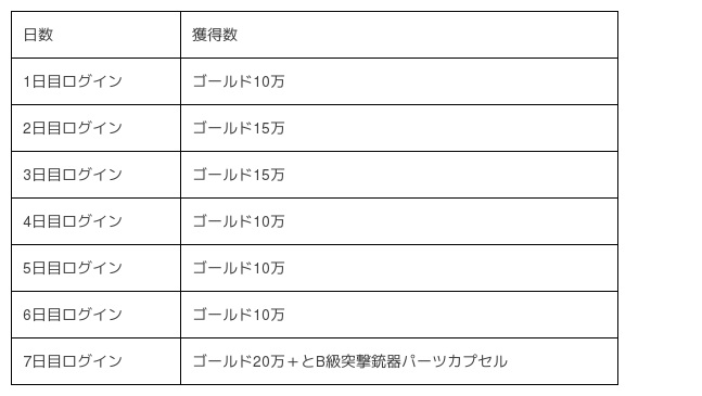 ・内容:7日間ログインすると最大ゴールド90万とB級突撃銃器パーツカプセルを獲得できます。