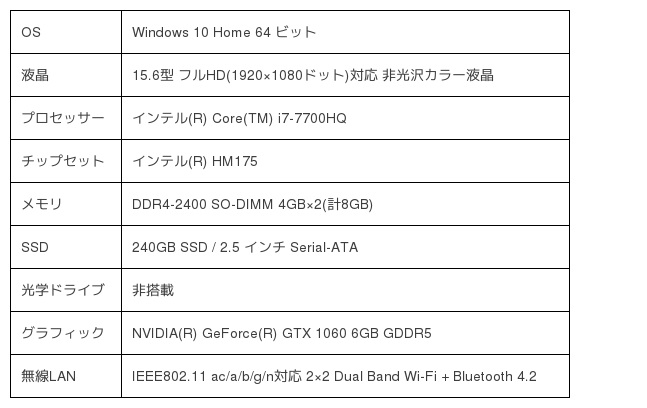 CPUにはインテル(R) Core(TM) i7-7700HQ、グラフィックアクセラレーターにはNVIDIA(R) GeForce(R) GTX 1060を搭載しており、ゲームプレイには充分なスペックを備えております。