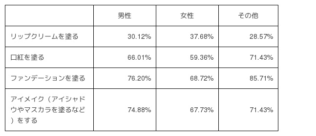 「リップクリームを塗る」ことに関しては、「化粧」と考える人の割合が男性よりも女性の方が7%ほど多く、一方、「口紅を塗る」「ファンデーションを塗る」「アイメイク(アイシャドウやマスカラを塗るなど)をする」ことに関しては、「化粧」と考える人の割合が女性よりも男性の方が7%前後多い傾向にあります。