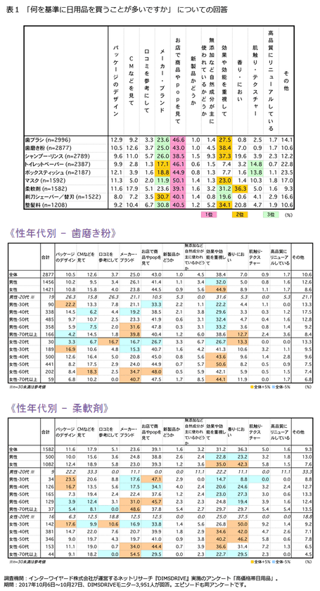 さらに、【歯磨き粉】【柔軟剤】について、性年代別の傾向を見てみました。品目による違いはあると思われますが、おおむね若年層ほど「パッケージのデザイン」「口コミを参考にして」が高く、年代とともに「メーカー・ブランド」が高くなっていく傾向が見られました。年齢を重ねるにつれてメーカーやブランドに対するイメージが定着していくからかもしれません。また男女別に見ると、特に【柔軟剤】では「香り・におい」で女性の数値が42.3%と高く、男性との差が19.1ポイント。全体で1位の「お店で商品やpopを見て」を抑え、女性では1位となりました。最近は【柔軟剤】の香りの種類が豊富ですが、【柔軟剤】を購入する際、女性は第一に“香り”で商品を選んでいることが明らかになりました。