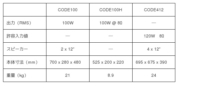 このたび大出力モデルのコンボアンプ 「CODE100」、アンプヘッド 「CODE100H」とスピーカーキャビネット 「CODE412」を発売します。出力は100Wで、自宅での使用に留まらず、ライブステージなどでの本格的な使用にも対応します。