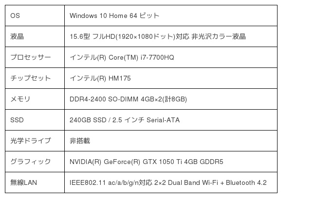CPUにはインテル(R) Core(TM) i7-7700HQ、グラフィックアクセラレーターにはNVIDIA(R) GeForce(R) GTX 1050 Tiを搭載しており、ゲームプレイには充分なスペックを備えております。