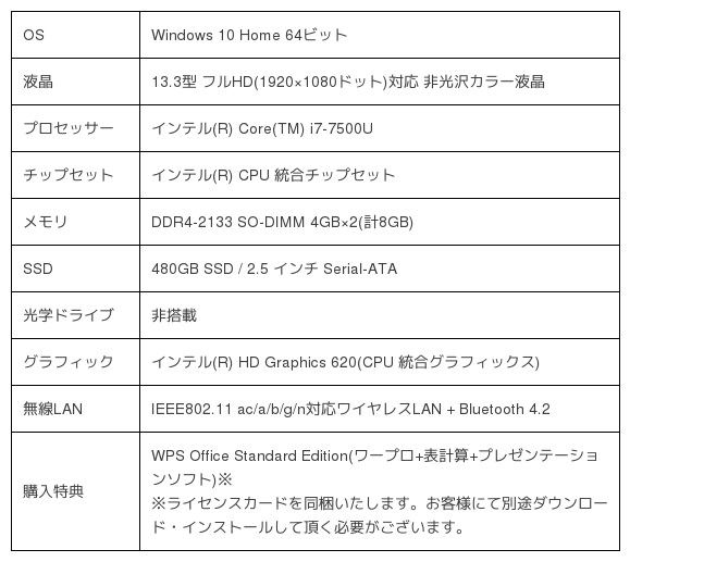 製品名 :STYLE-13FH052-i7-HMES-20TH [Windows 10 Home]