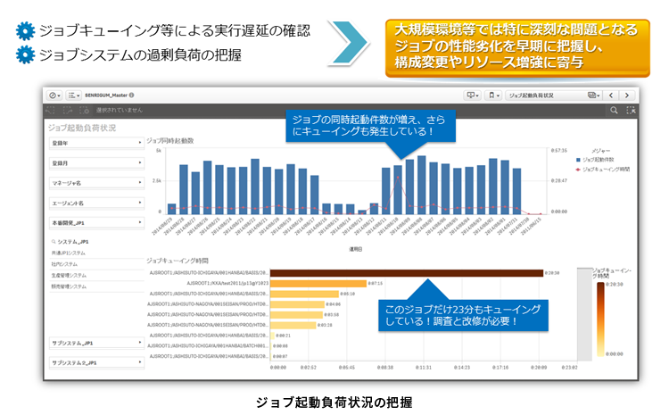 これらの機能強化により、大規模な環境であってもジョブ稼働の「変化」や「いつもと違う」を効率的かつピンポイントで捉え、ジョブ異常や遅延の予兆原因、改修/改善に繋がる最適解を提供し、安定的なジョブ運用の実現を支援します。