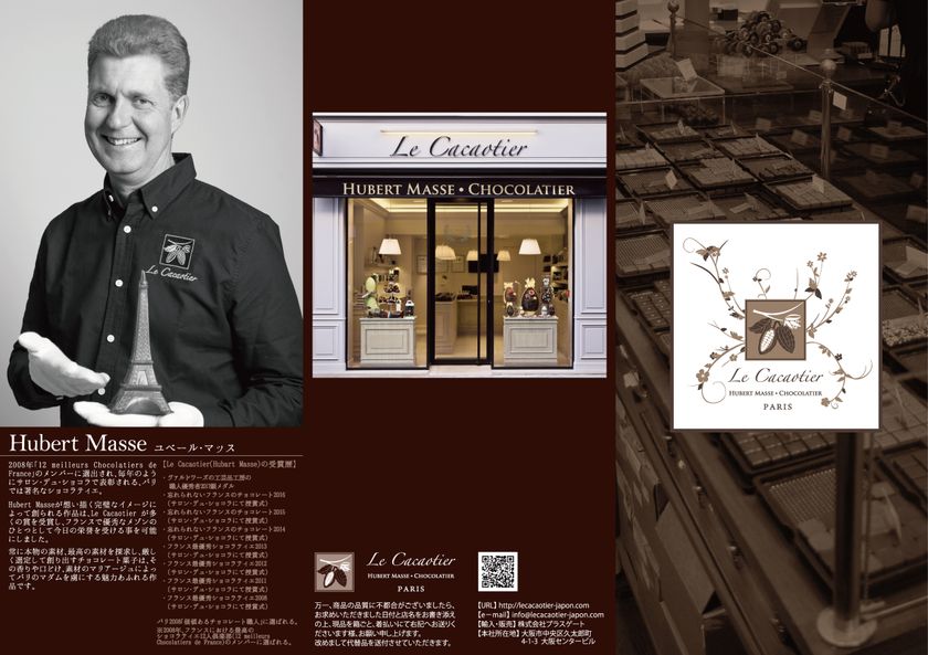 「Le Cacaotier(ル・カカオティエ)」はフランス国内に8店舗を展開し、2008年パリのサロン・デュ・ショコラで表彰されて以来、毎年のように表彰される実力派ショコラブランドです。ショコラティエ ユベール・マッス氏のショコラの特徴は「一粒の中のテイストの変化と完璧な調和」です。「Le Cacaotier(ル・カカオティエ)」の本格的な発売(東京・名古屋の有名百貨店14店舗で販売)は日本初です。