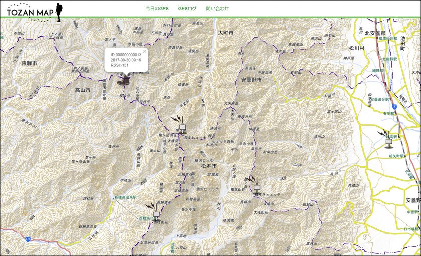 「TozanMap」は登山者が重さ60gほどのGPS付き登山者端末を携帯し、山小屋に設置した基地局と中継局を通じて位置情報をクラウドにアップし、スマートフォンやPCなどのブラウザで登山者の位置情報をリアルタイムに確認できるシステムです。( https://tozanmap.jp )
