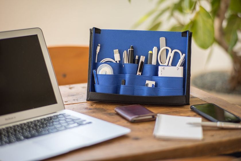 この便利な青海波ポケットを使って、ワーカーや、趣味を楽しむ人へ、とびきりのツールを作りたい。そのような新商品の構想を練る中でふと目にした、「文具や書類が散らばった机上からお目当てのものを取り出すのに手間取っていた」光景。