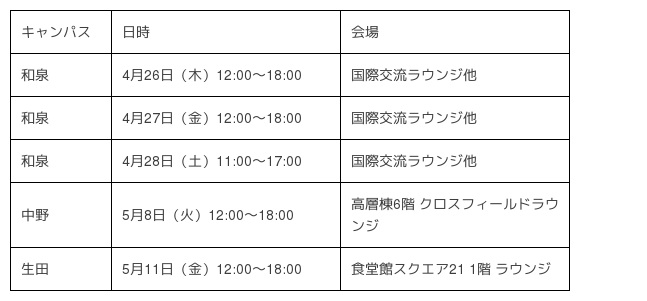 ※詳細については、明治大学HP(http://www.meiji.ac.jp/cip/usefulinfo/festa.html)をご確認ください
