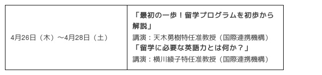 4月28日(土)は、長期留学に向けた準備セミナー、TOEICやIELTS試験実施団体担当者による説明会、留学助成金講座など、1日で留学制度や留学準備について理解できるよう、充実したプログラムを実施します。