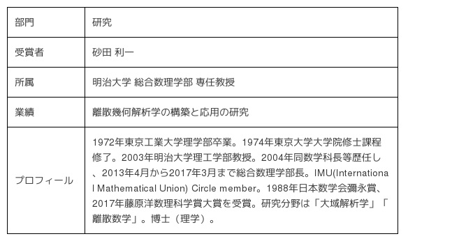 科学技術に関する研究開発、理解増進等において顕著な成果を収めた者を顕彰する「平成30年度科学技術分野の文部科学大臣表彰受賞者」に明治大学・総合数理学部の砂田利一教授(専門:幾何学、 数学基礎・応用数学)が選ばれました。