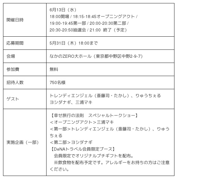 オンライン総合旅行サービス「DeNAトラベル」(URL:http://www.skygate.co.jp/)を運営する株式会社DeNAトラベル(本社:東京都新宿区、代表取締役社長:大見 周平、以下DeNAトラベル)は、ひとり旅や友達との旅、パートナーとの旅などにおける「幸せ旅行」をテーマにした無料イベント「DeNAトラベル流幸せ旅行の法則」をなかのZERO大ホールにて6月13日(水)に開催します。