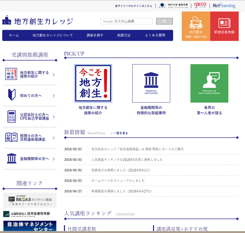 公益財団法人 日本生産性本部は、地方創生の官民の担い手を養成するため、国による地方創生事業の一環として2016年12月に「地方創生カレッジ」を開講しました。今年で3周年目となり、2018年5月現在、130講座が無料で視聴可能となっています。