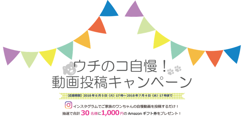 ご家族の一員であるワンちゃんの自慢動画をInstagram(インスタグラム)に投稿いただくと抽選で30名様に1,000円分のAmazonギフト券が当たるキャンペーンです。「ウチのコってこんなにカワイイんだよ!」と自慢したくてウズウズしている方、ご投稿お待ちしております。