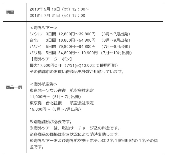 本キャンペーンでは、5月〜10月に出発する特別価格の海外ツアーや、お求めやすい価格の海外航空券を販売します。東京発ソウル3日間12,800円〜39,800円、台北3日間16,800円〜54,800円、ハワイ5日間79,800円〜94,800円、バリ島5日間34,800円〜119,900円等のお買い得商品を多数用意しました。