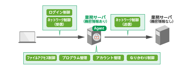 業務サーバ側にエージェントを導入することで、OSだけでは実現できない特権アカウント単位での細かなサーバのアクセス制御、ネットワーク制御、および全ての操作に関して改ざんできないログを取得します。root、Administratorに対しても制御を行うことで、監査対応、内部不正アクセス、標的型攻撃、環境・ニーズ変化で起こる様々な課題に対応することができます。