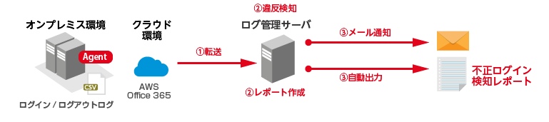 各種サーバOSのログイン/ログアウトのログを収集し、不正ログインを検知してリアルタイムに管理者に通知します。またログ管理サーバにて保管したログイン/ログアウト/OS操作ログは、改ざんできないログとして長期保管し、いつでも調査・分析ができるようにします。不正ログイン検知レポートを作成すれば、インシデント対応や監査対応の効率化にもつながります。